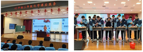 为切实落实在教育“双减”中做好科学教育加法,充分发挥学校育人主阵地作用,满足学生个性化发展需求,四十一中学开展了各学科的课后服务。例如信息技术组结合新课标的变化,在初中学段开展人工智能课后服务。学生在活动中获得编程基础知识,以及学编程、用编程的能力,领悟到编程技术的奥秘;初中化学组设计了一系列与日常生活紧密相关的科学主题课后服务,如《营养与健康》、《燃烧与灭火》、《自制酸碱指示剂》、《氧气与二氧化碳》、《生活中的溶液》等。
