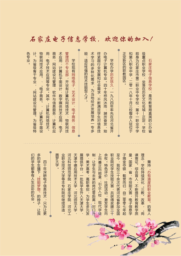 四十年深耕电子信息技术,只为让更多的学生播下“技能梦想”的种子,让我们的学生都享有人生出彩的机会。“技能梦想”的种子,让我们的学生都享有人生出彩的机会。