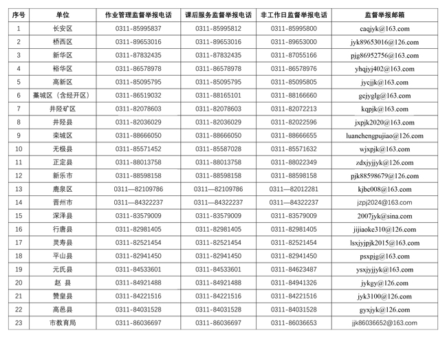 为进一步规范义务教育学校作业监管和切实提高义务教育学校课后服务质量,现将市、县两级教育行政部门“双减”工作(校内)的监督举报电话和邮箱公布如下,受理群众对学生作业负担和课后服务方面问题的举报。请学生、家长、社会各界共同监督,为学生身心健康成长提供有力保障。