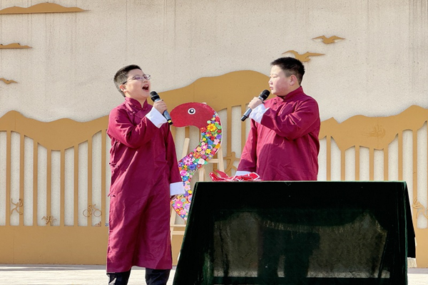 ↑2月17日,在石家庄市天苑小学开学典礼上,学生在表演相声。(冯嘉宝 摄)