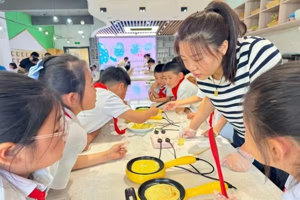 记者在石家庄市柏林庄学校看到,学校以鸡蛋为主要食材,让学生化身“厨房小达人”,开启了一场与鸡蛋的奇妙邂逅。活动中,学校邀请家长志愿者走进校园,为学生们讲解了如何制作鸡蛋饼、蛋挞、蛋糕等食物。家长志愿者一边示范一边讲解,同学们围在旁边,眼睛紧紧盯着每一个动作,生怕错过任何一个细节。伴随着滋滋的声响,同学们观察面糊从液态变成“金毯”的过程,手中的铲子不时翻面,做出了一张张金黄的鸡蛋饼。烤蛋挞环节中,同学们分工明确,进行着打蛋、搅拌蛋液、摆放蛋挞皮、倒蛋液等准备工作。随着烤箱“叮”的一声清脆提示音,他们迫不及待地打开烤箱门,一股浓郁的奶香与蛋香扑鼻而来,瞬间弥漫了整个教室,看着一个个金黄诱人、身披酥脆外皮的蛋挞,同学们感受到满满的成就感。