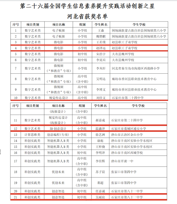 在刚刚结束的第二十六届全国学生数字素养提升实践活动中,河北省7市14所学校的21名学生荣获全国“创新之星”称号,获奖人数创历年之最。河北省教育技术中心获得组织工作突出单位。